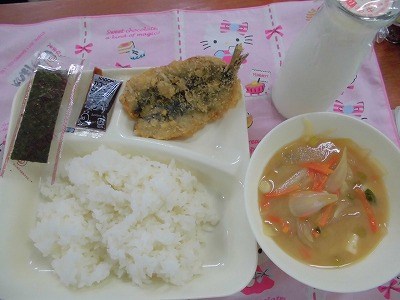 「いわしのフライ」は大ぶりで、開きをフライにしていました。小骨もありましたが、低学年さんでも問題なく食べれました。サクサクで、トンカツソースも付いていて、おいしくいただきました。