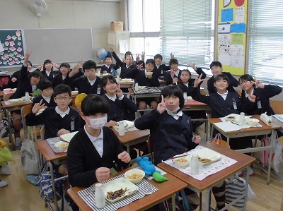 「焼きのり」も。子どもたちに人気です。ご飯に巻いておにぎりのように食べている子もいました。低学年では、おはしを使ってのりでごはんを巻き込むのが難しいようで、手で食べている子もいました。