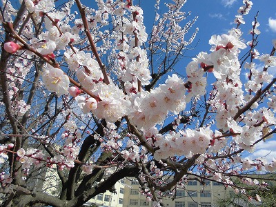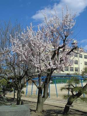 運動場の向こうには「杏(アンズ)」の花です (3月15日)