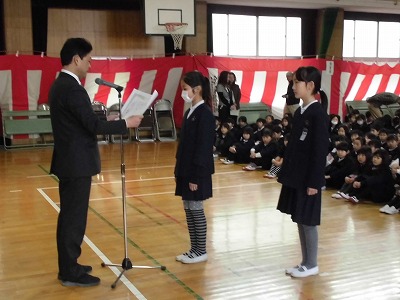 そして、校長より5年生の代表児童に「修了証」を手渡し、1年間の頑張りと、振り返りについて、また、周りの人、学校においては友だちや担任の先生に対しての感謝の気持ちを持ってほしいなどの話をしました。