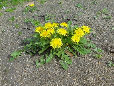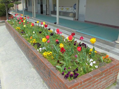 春の陽気に給食室前の花壇は色鮮やかになりました。