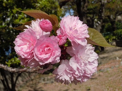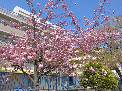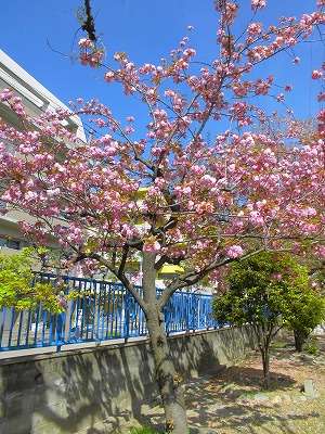 桜ノ宮の造幣局の桜の通り抜けは八重桜で有名で、今年も14日(木)まで開催していますが、本校にも八重桜が1本あり、見ごろを迎えています。