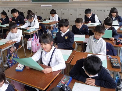 特別に画用紙で作ったファイルに、取り組みに使う文章の書かれたプリントを重ねて貼っていきます。