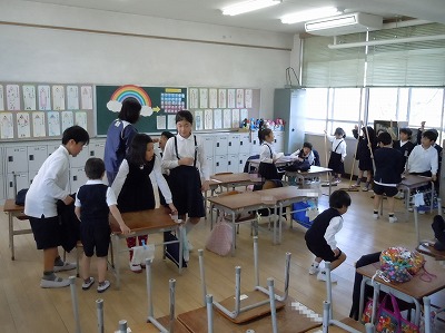 重い机も二人で協力して運びます。長いほうきもうまく使います。ぞうきんで机や窓も吹きます。きれいになった教室に満足していました。