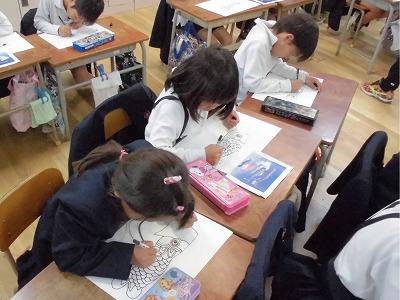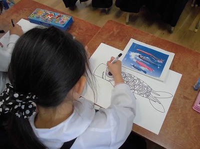このクラスでは、先生が用意してくれた「こいのぼり」の写真も参考に、先生の説明をしっかりと聞き、画用紙にサインペンで「こいのぼり」を描いていました。