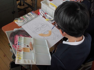 このクラスでは、下書きが終わり、水彩絵具を使って、色を塗る作業が始まったところです。