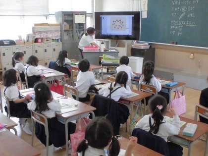 子どもたちの教科書と同じイラストが大型モニタに映ったデジタル教科書では動き回ります。子どもたちも興味を持って、楽しく学習に取り組んでいます。