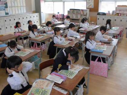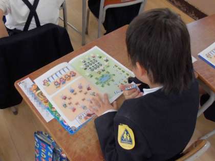 教科書に書かれた動物などのイラストを使って、数を数えたり、比較をしたりしています。