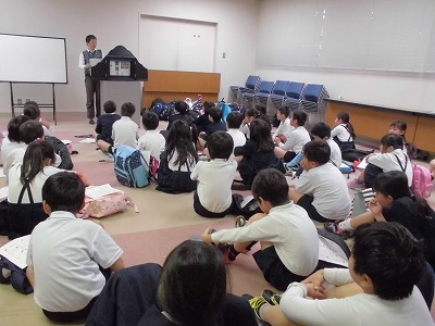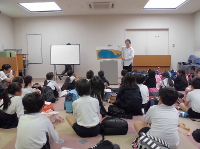 図書館の使い方を紙芝居で教えていただいたり、パネルで図書館にあるものを教えていただきました。最後は大型絵本「くじらだ!」も読んでいただきました。