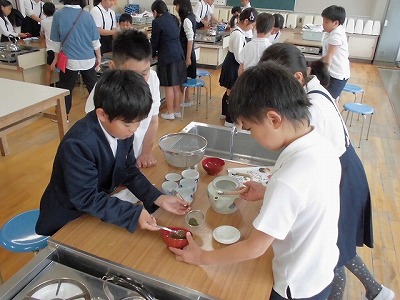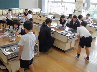 当然、調理実習も始まります。今日は、「はじめてみよう クッキング」の単元の最初「クッキングはじめの一歩」の学習で、ガスコンロを使ってお湯を沸かす学習です。