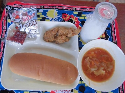 ミネストローネは、すべて給食室での調理です。鶏肉、にんじん、玉ねぎ、キャベツ、トマト、てぼ豆、パセリが入っていました。フレッシュトマトの酸味がいい感じでした。