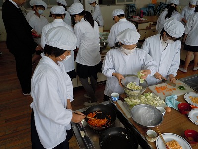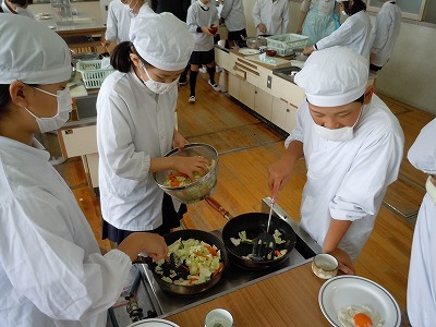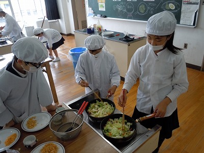 フライ返しや菜箸を使って、まんべんなく火が通るように注意しながらいためていきます。途中で、味付けの塩コショウも忘れずにかけていました。