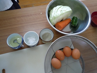 材料は「たまご」と「キャベツ・にんじん・ピーマン」です。調味料も「サラダ油・塩コショウ・砂糖」が準備されています。