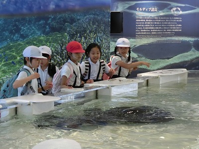 子どもたちはおっかなびっくり、エイやサメの背中を触っていました。