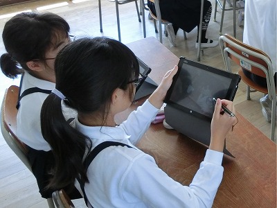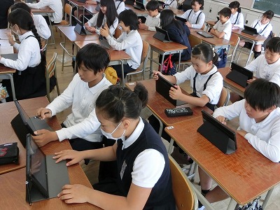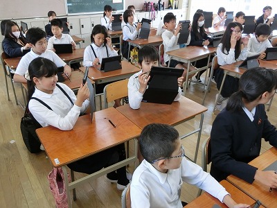 昨年度末に整備しましたタブレットPC(40台)を、6年生のあるクラスで1人1台ずつ配布し、使い方のレクチャーを受けていました。