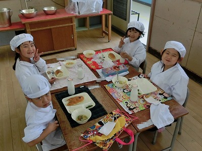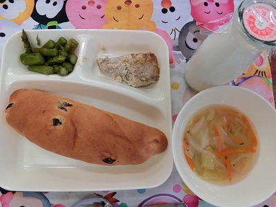 グリーンアスパラガスのソテーは、塩ゆでした後、オリーブ油で炒め、塩コショウで味付けです。低学年さんでは、アスパラガスが苦手な子が少し目立ちました。お家ではどうですか?