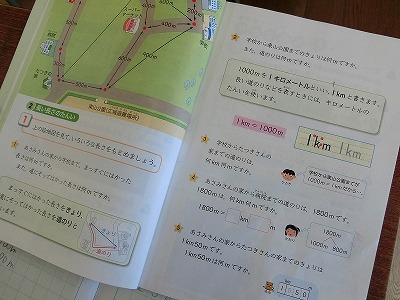 今日は「1000mを1キロメートルといい、1kmと書きます」、「道のりのときはkmを使う」という学習をしていました。