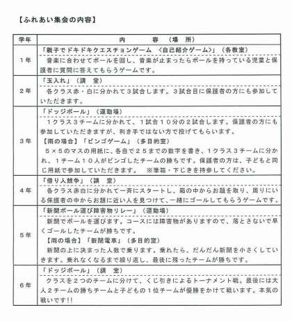 「ふれあい集会」では、PTA各学年委員会の方と先生とで楽しい活動となるよう準備してくださっています。保護者と子どものふれあい、さらに、同じクラスの保護者同士のふれあい、担任の先生とのふれあいを大いに楽しみましょう。