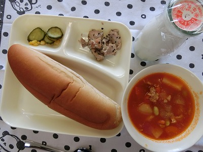 ケチャップ煮は、豚肉、ジャガイモ、にんじん、玉ねぎ、枝豆が入っていました。チキンスープをベースにケチャップとトマトピューレを加えて煮込まれていました。ケチャップ大好きな子どもが多いので、すぐに食缶も空っぽです。