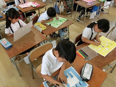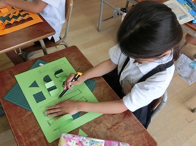 先日の授業参観では、おうちの人に助けてもらいながら「カッターナイフ」を使って作業をしましたが、今日は、自分一人で挑戦です。