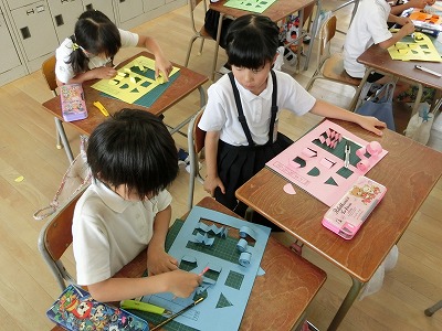 カッターナイフで上手にカットした画用紙は、別の台紙となる白の画用紙に貼りつけ、切り取られて窓のようになった部分に絵を描いていきました。