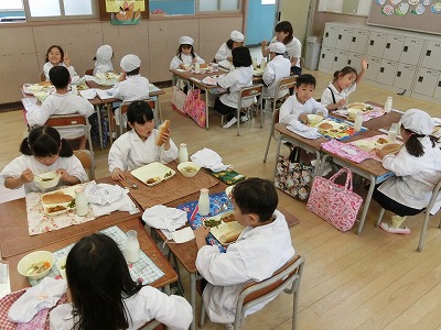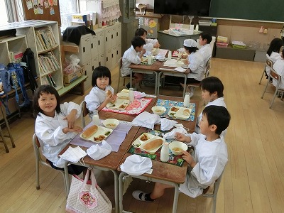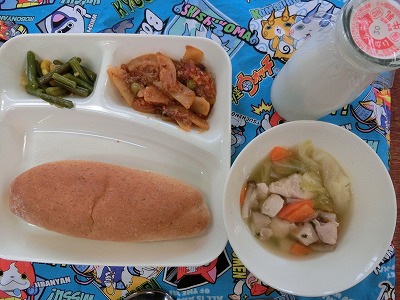 三度豆のソテーは、三度豆とコーンをサラダ油で炒め、塩コショウで味付けしたもので、彩りもよく、1年生でも器からあふれるほど、お替りをもらっている子もいました。