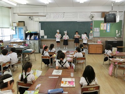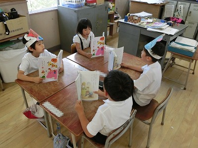 班で相談して「ねずみ」さん、「もぐら」さん役を決め、それぞれの台詞部分を読みます。お面も作りました。班メンバーの残りの2〜3人は、その他の部分を読みます。