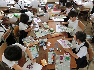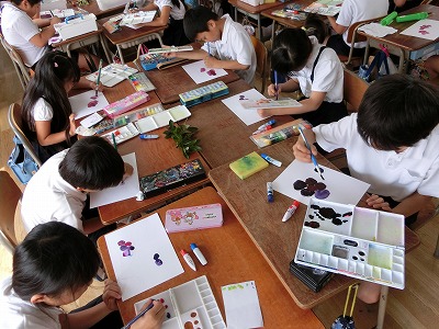 こちらのクラスでは、水彩絵の具を使って、下書きなしで、特に鮮やかな実の色に着目して絵を描きました。