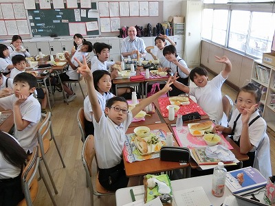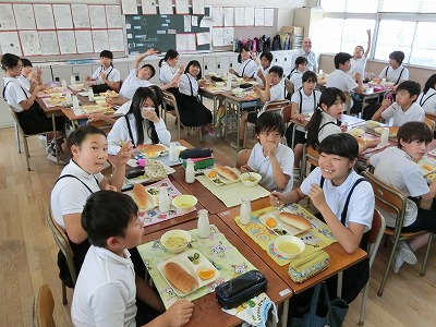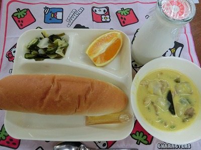 かぼちゃのクリームシチューは、かぼちゃもやわらかく煮こまれていて、かぼちゃの黄色い色がシチューに出ていました。鶏肉、ベーコン、玉ねぎ、枝豆、マッシュルームも入っていました。