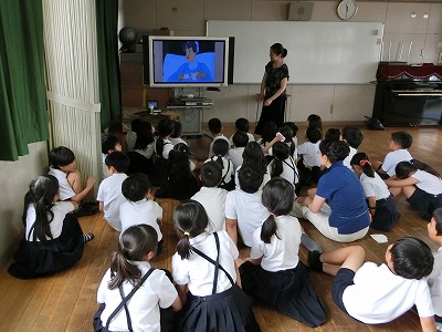 今日はいつもと違って、多目的室で「シンデレラ」の英語版(日本語の字幕もなし)の鑑賞でした。子どもたちは、すべての言葉はわかりませんが、物語の筋は知っているので、興味を持って観てくれていました。途中、知っている英単語が出てくると、声に出して言っていました。