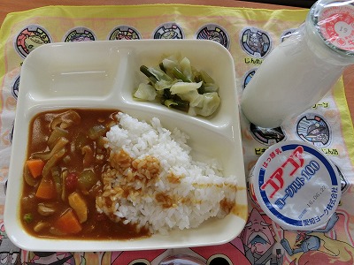 今日は約1ヶ月ぶりのカレーライスでした。今日はチキンカレーですが、いつものようにジャガイモ、ニンジン、玉ねぎ、トマト、グリーンピースなどの野菜もゴロゴロと入っています。どのクラスもお替りで大盛りカレーライスの子が続出でした。