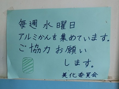 毎週水曜日の朝は、美化委員会の子どもたちが当番で正門と裏門に立ち「毎週、水曜日は、アルミ缶の回収をしています。ご協力、お願いします。」と、大きな声で、当呼応してくる児童に声掛けをしてくれています。校内にもポスターを掲示しています。