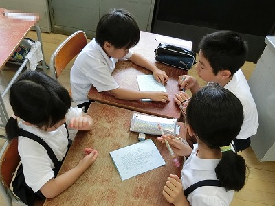 今朝の児童集会では、豊新フェスティバルのお店をどの順番で回って行くかを、たて割り班の中のグループで相談しました。