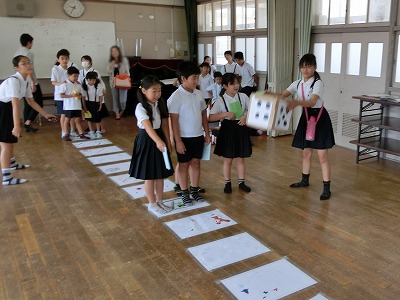 お店回りは、班内で高学年の子が低学年の子のことも考えながら、校内を移動していました。お店の中では、説明をしてあげたり、一緒にゲームをしてあげたり、とても親切にできていました。