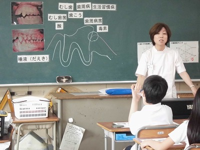 本日、6年生は歯科衛生士の方に来ていただいてクラスごとに「歯と口の健康教室」を行いました。(2限…2・3組、3限…1組)