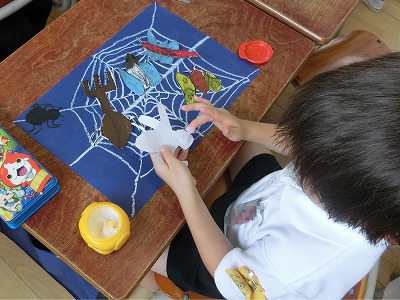 別の画用紙に、思い思いの虫(バッタ、チョウ、カマキリ、てんとう虫、かぶと虫など)を描き、はさみでていねいに切り取って、それらをクモの巣の上に貼りつけていきました。