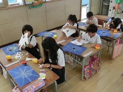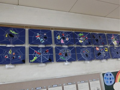 1年生のこのクラスでは、「くものすでつかまえた」というタイトルでパスとはさみを使っての作品に取り組んでいました。