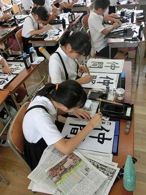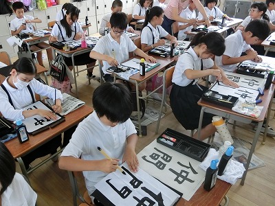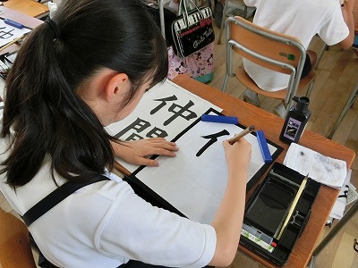 子どもたちは、やはり「門」に苦戦していました。内側に書く「日」を意識しすぎて幅広になったり、縦の長さが足りずに「日」が下にはみ出したりと、かなり練習を重ねていました。