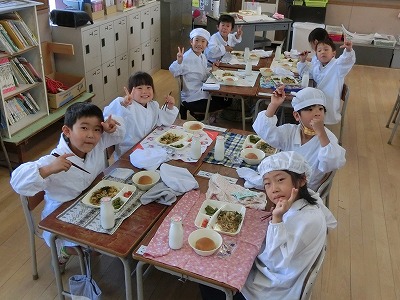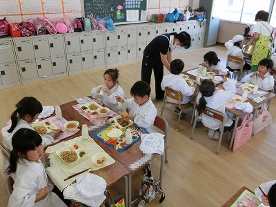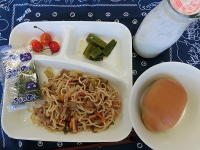 焼きそばは、子どもたちに大人気メニューです。豚肉とイカも入っているミックス焼きそばでした。子どもたちは大きく口をあけ、おいしそうにほお張っていました。先生にお替りをお願いする子も多くいました。