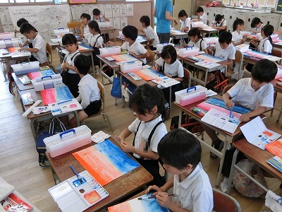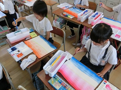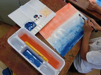 先生から、パレットや水入れの使い方、絵具と水の量の説明を聞いて、「空とうみ」というテーマで、空は「赤色」(夕日?)、海は「青色」を使って、グラデーションになるように描いていました。