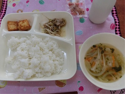 厚揚げのしょうがじょうゆ油かけは、「しょうが」がどうかな?、苦手かな?、と思ったいましたが、しっかりした味付けで、ごはんの進むおかずで、子どもたちもお替りをしてたくさん食べていました。