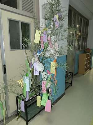 子どもたちは先生から短冊をもらい、お願い事やイラストを書いて、ササに取り付けました。「泳げるようになりたい」「字が上手になりたい」「将来、○○になりたい」「ずっと元気で暮らしたい」など、様々でした。