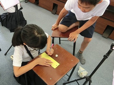 以前には、1年生の取り組みを紹介しましたが、今日は2年生の教室前にもササが観られました。帰りまでには、願を書きつづった短冊、折り紙で作った飾りがつけられ、きれいでした。
