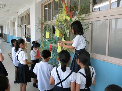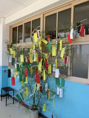 写真は音楽室前のものです。3年から5年生児童の合同のものです。教室で書いたり、音楽の時間に書いたりして飾っています(ササは3本あります)。また、「七夕」の歌も歌いました。