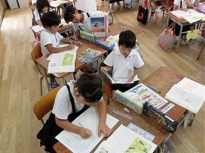 「まよい犬を さがそう」という単元の学習です。たくさんいる犬の中から一匹を選び、その特徴(大きさ、色、模様、耳の形、しっぽの形、首輪の有無など)をとらえ、文章にしていきます。