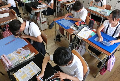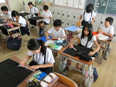 今日は、生地に縫うために折り返す部分にチャコペンシルでしるしを入れました。本格的にミシンで縫う作業は2学期に入ってからだそうです。