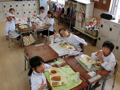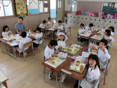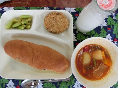 ケチャップ煮は、豚肉と、じゃがいも、玉ねぎ、にんじん、三度豆、トマトと野菜たっぷりで、子どもたちの好きなケチャップで煮込まれていますが、トマトの酸味も効いていました。「ハート型」のラッキーニンジンも入っていました。