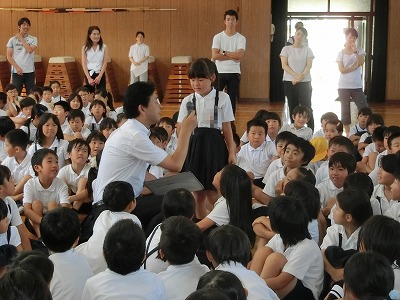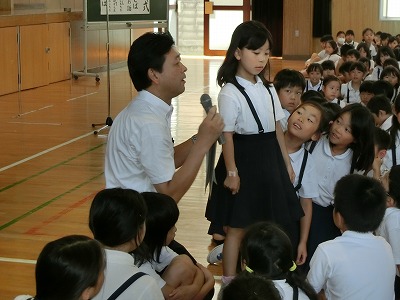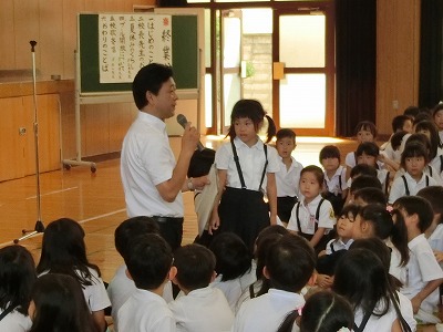 みんなへのインタビューの後は、夏休みを思いっきり楽しんで、たくさんの思い出を作ってほしいこと、家族の一員としてお手伝いをしてほしいこと、事故やトラブルに巻き込まれないこと、特に水に関する事故に注意することのお話をしました。