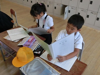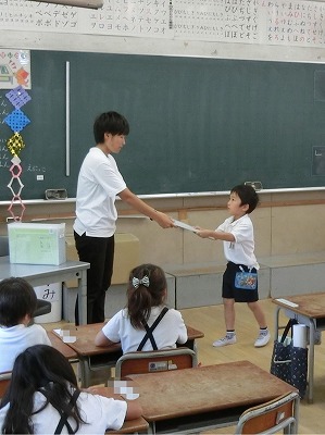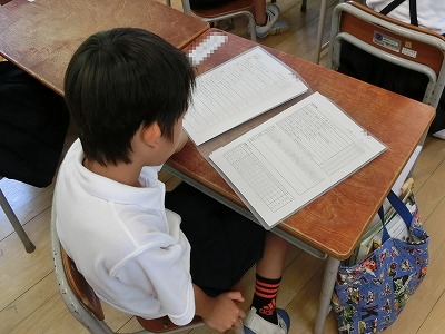 1年生も小学校に入学し、初めての「通知票」です。子どもたちも少し緊張気味で、担任の先生から一人ひとり手渡されると、自分の席に戻ってこっそりと中身を観る子、うれしくて友だちと見せ合いっこする子・・、「やったぁー!!」「うわぁー!!」など様々でした。お家の人にも見せて、しっかりと1学期の頑張りを話してください。そして、たくさんたくさんほめてもらってください。