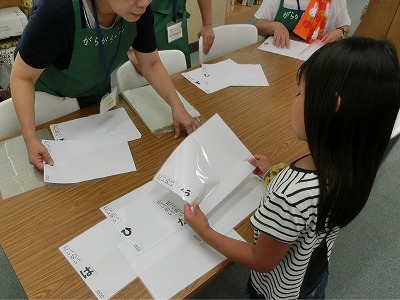さらに、今日は絵本コーナーのタイトル別に分けるカードが傷んできたので、みんなで「あ」〜「わをん」までの新しいカードを、ラミネートして作り変えをしました。